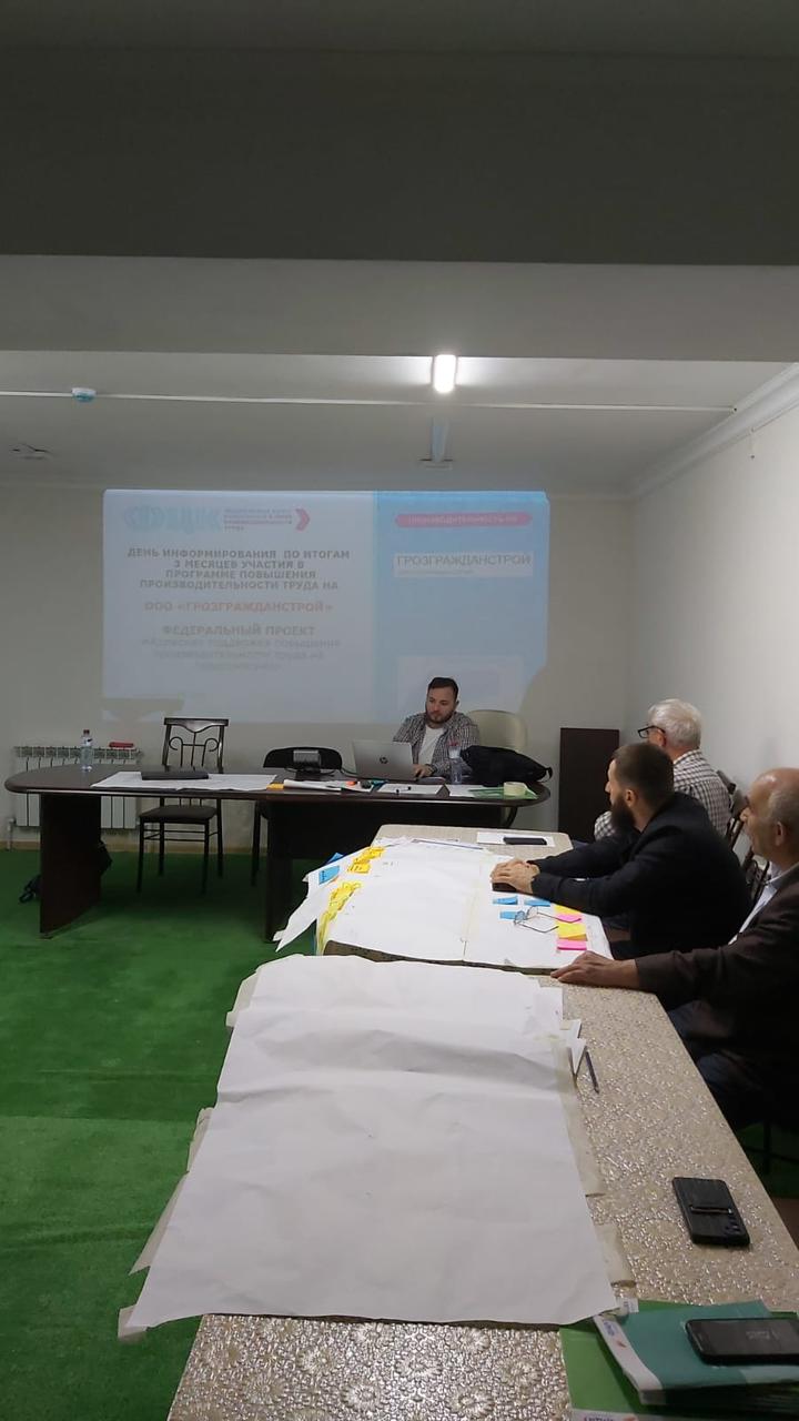 Очередные мероприятия прошли в аудитории ООО «Грозгражданстрой» рамках реализации национального проекта «Производительность труда», под руководством тренеров-консультантов Федерального центра компетенций (ФЦК) А.М. Новикова и Е.В. Казанцевой. Рабочая группа, состоящая из сотрудников ООО «Грозгражданстрой», подвели промежуточные итоги и в результате подготовлен план мероприятий на ближайшие 2 месяца для улучшения процессов.