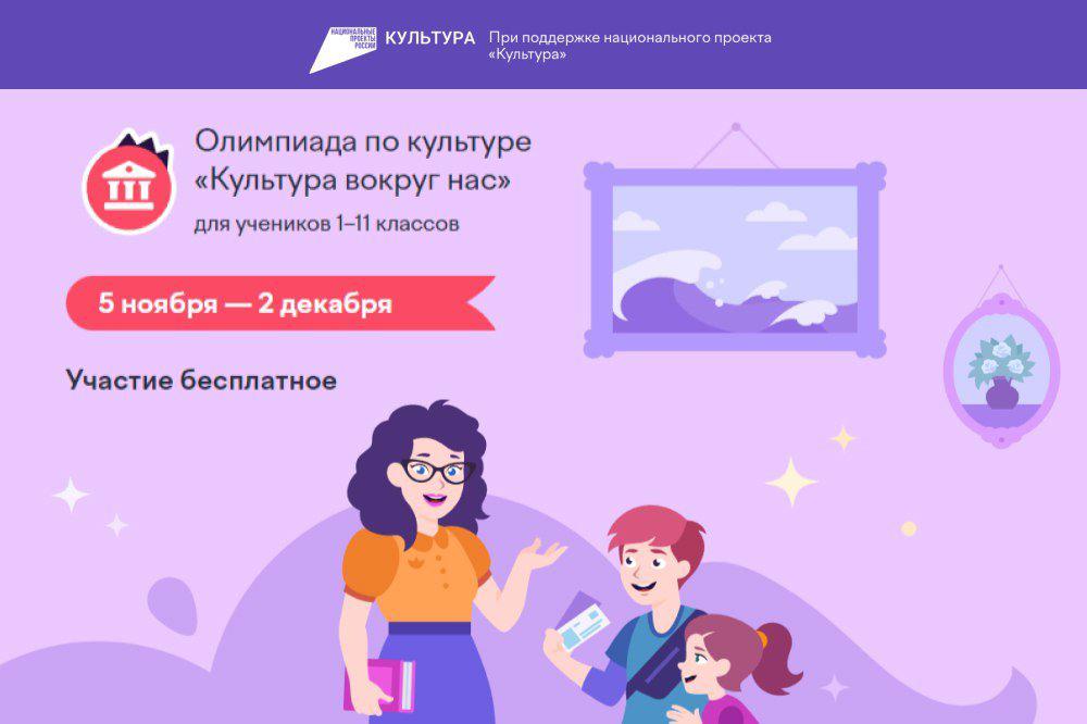 С 5 ноября по 2 декабря у школьников с 1 по 11 классы будет возможность принять участие в онлайн-олимпиаде «Культура вокруг нас» на образовательной платформе Учи.ру. Ключевая цель соревнования — развить интерес к русской культуре — языку, литературе, истории и искусству — и взглянуть на нее через призму современной жизни. Проект реализуется при поддержке национального проекта «Культура».